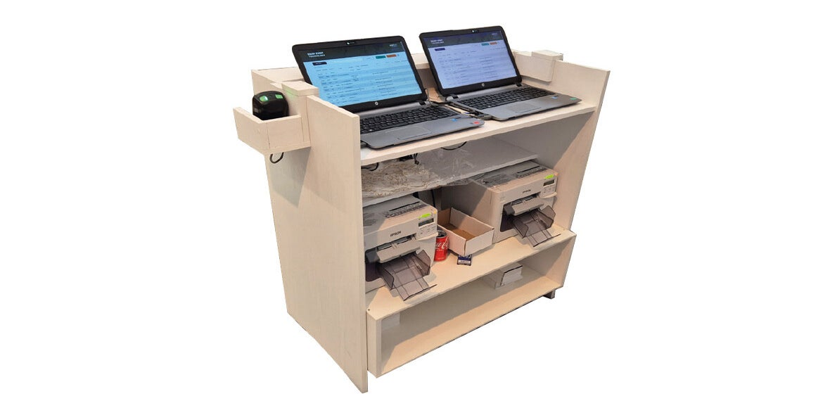 - witte desk met backlit frontdoek, een extra schap achteraan en 2 "scannerhouders" die aan de zijkant bevestigd kunnen worden - u kan de printspecs voor de aanmaak van het artwork hiernaast downloaden